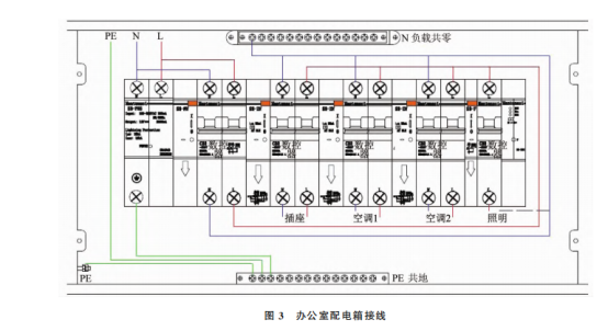 智慧用電監(jiān)管平臺設(shè)置每個宿舍由一個空氣開關(guān)控制,配電箱接線如圖2所示。每個公室由一個空氣開關(guān)控制,配電箱接線如圖3所示。每個公共區(qū)域照明燈由一個空氣開關(guān)控制,配電箱接線如圖4所示。可分別對各回路電流、功率進行設(shè)定,當回路電流或功率超過限定值時,該回路自動跳閘保護。自由設(shè)定宿舍空調(diào)、照明及插座等每個回路的開啟和關(guān)閉時間,通過手機遠程管理,同時可以按鍵自動控制,也可以通過手動推桿控制通斷電。一旦發(fā)現(xiàn)險情,立即預警,并發(fā)送預警信息至手機應(yīng)用程序及微機端。通過告警功能、預警機制,及時發(fā)現(xiàn)配電系統(tǒng)設(shè)備、周圍環(huán)境的異常情況,以便及時進行檢查與維護,防止意外事故發(fā)生。
