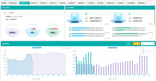 針對校園水、電、氣等各類接入能源進行統(tǒng)計分析,包含同比分析、環(huán)比分分析、損耗分析等。了解用能總量和能源流向。