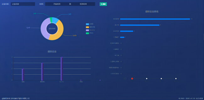 超標分析:對相關的采集數據油煙、顆粒物、NMHC數據進行關聯分析,對超標的種類、企業進行餅狀圖的展示,同時對報警企業進行排名,根據排名情況對相關企業進行數據和運行狀態的分析評價。