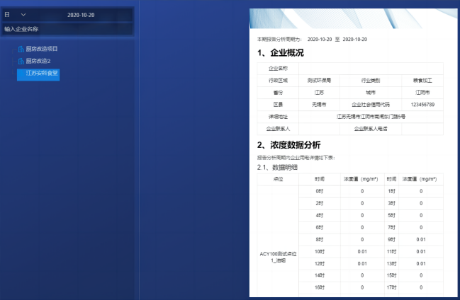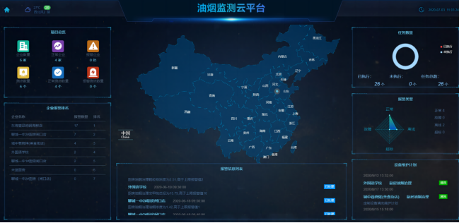 接入企業,顯示接入的企業數,監測點位數;AQI天氣,實時AQI天氣狀況;告警率、超標率、在線率顯示告警企業數量,告警率,包括超標、在線率統計。