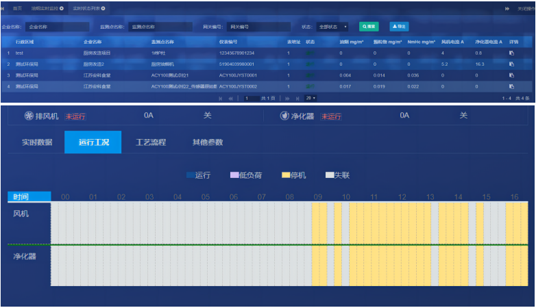 實時監控:運行工況;實時監測數據包括油煙凈化器和風機的運行電流,根據電流數值來判斷當前進化器的運行狀態,包括失聯、停機、運行等狀態,結合運行數據曲線,更加方便直觀。