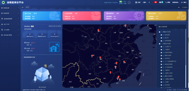 餐飲油煙監測平臺GIS地圖采集餐飲油煙處理設備運行狀態和油煙排放的濃度數據,自動對超標排放及異常企業進行提示預警,監管部門可迅速進行處理,督促餐飲企業整改設備,并定期清洗、維護,實現減排環保,不擾民等目的。