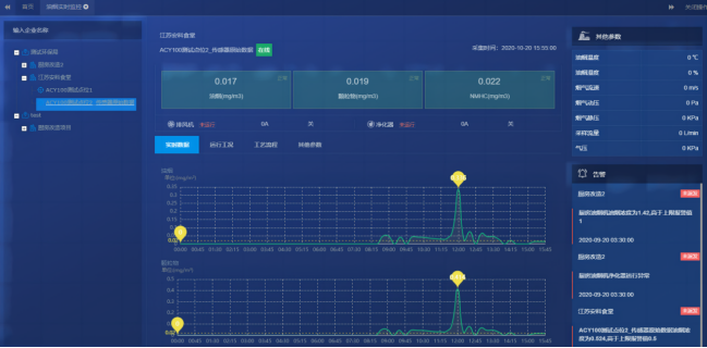 現場安裝油煙在線監控儀,實時監測排煙煙道內的油煙、顆粒物和非甲烷甲烷總烴等濃度,同時對油煙凈化器和風機的運行電流和開關狀態進行監測,一旦排放超標,系統會發出告警信息。
