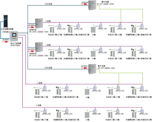 AFRD100防火門監控系統采用AFRD100/B防火門監控器(主機)+區域分機+防火門監控模塊三層結構組網模式,適用范圍廣,滿足各種環境現場,便于區域化管理,監控模塊與監控器之間采用二總線通訊,監控器與分機之間采用CAN總線通訊,滿足了通訊實時性高的要求。