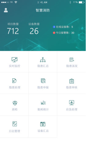 APP支持Android、iOS操作系統,方便用戶查看電氣火災、防排煙、消防水、消防設備電源、防火門、消防設備管理、視頻監控、火災報警等子系統的實時監控數據、報警信息、能耗統計等。