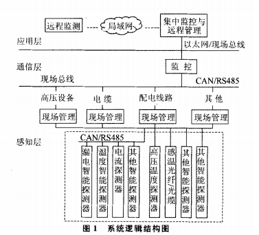 智能化監(jiān)控系統(tǒng)基于嵌入式軟硬件平臺,嚴(yán)格遵從“設(shè)備智能化、系統(tǒng)網(wǎng)絡(luò)化、狀態(tài)信息化、安全可視化”的產(chǎn)品定位,構(gòu)建一體化分布式電氣火災(zāi)智能化綜合監(jiān)控系統(tǒng)。系統(tǒng)架構(gòu)基于物聯(lián)網(wǎng)系統(tǒng)模型及B/s軟件體系,按照“感知層、通信層、應(yīng)用層”標(biāo)準(zhǔn)實施系統(tǒng)建模。系統(tǒng)組成具體包括:處于感知層的電氣火災(zāi)監(jiān)控探測器、無線溫度探測器、分布式感溫光纜等;處于網(wǎng)絡(luò)層的通信網(wǎng)絡(luò)、現(xiàn)場總線及實現(xiàn)區(qū)域監(jiān)測管理功能的監(jiān)控器等;處于應(yīng)用層的監(jiān)控設(shè)備、遠(yuǎn)程監(jiān)控中心及客戶終端等。系統(tǒng)邏輯結(jié)構(gòu),如圖1所示。