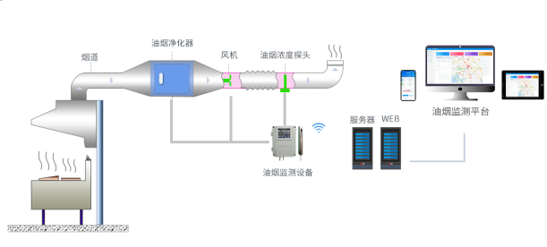 對(duì)油煙排污數(shù)據(jù)的監(jiān)測(cè),包括油煙排放濃度,顆粒物,NmHc等數(shù)值采集監(jiān)測(cè);同時(shí)對(duì)監(jiān)控風(fēng)機(jī)和凈化器的啟停狀態(tài)、運(yùn)行數(shù)據(jù)進(jìn)行監(jiān)測(cè)。