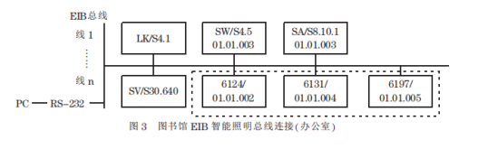 在此以辦公室為例,應用系統控制軟件 ETS3,選擇相關設備進行總線連接。元件包括 LK/S4.1 線路耦合器,SV/S30.640 電源供應器,SW/S4.5 定時控制器,6124 四鍵帶顯示智能控制面板,6131 移動探測器,6197 調光控制器,SA/S8.10.1 開關驅動器,通過配置物理地址,進行總線連接。如圖 3 所示: