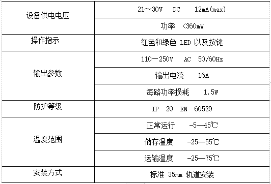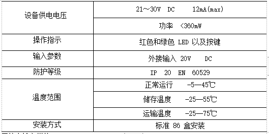 用于接受外部干接點信號輸入,可通過不同參數配置實現開關、調光、場景、窗簾控制、調溫、報警等功能,電氣參數如下: