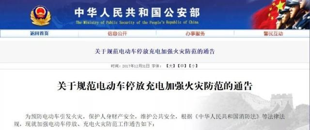 電動自行車的安全隱患引起了各級政府部門的重視,20171229日公安部消防局發布《關于規范電動車停放充電加強火災防范的通告》,要求充分認識電動車火災危害,落實停放充電管理責任,規范電動車停放充電行為,嚴厲查處違規停放充電行為。