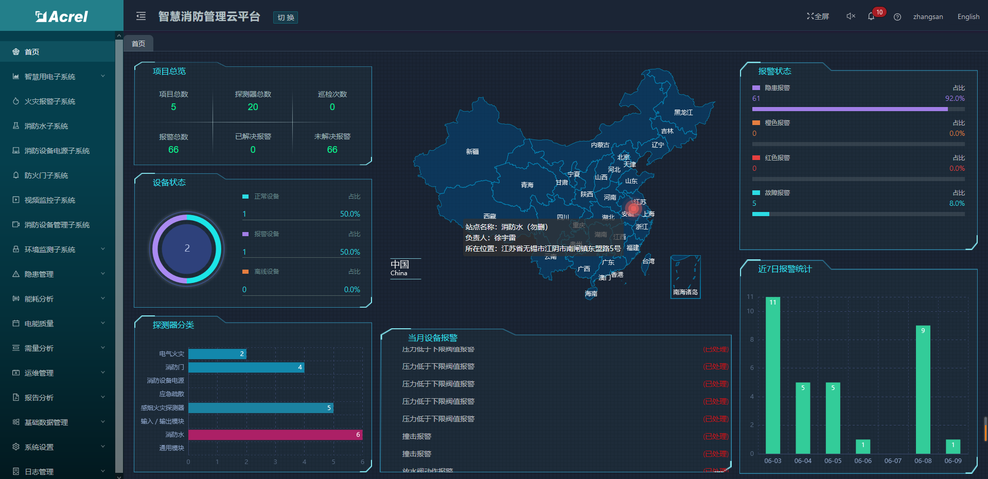用戶登錄成功之后進(jìn)入主頁,如圖所示。主要展示的內(nèi)容有:項(xiàng)目概況、設(shè)備狀態(tài)、設(shè)備分類、設(shè)備報(bào)警信息、報(bào)警分類、報(bào)警統(tǒng)計(jì)、設(shè)備臺賬信息等。其中百度地圖可以選配成BIM建筑模型,任何傳感器報(bào)警時(shí)可以在BIM模型中預(yù)警顯示。