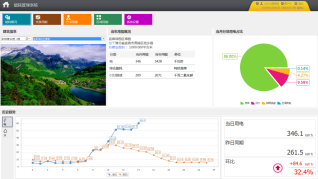 系統可以按照分項進行能耗統計與顯示。其中,日分項用能同比分析圖顯示不同分項的當日與昨日能耗柱狀圖(藍色柱表示今日,綠色柱表示昨日);用能餅圖顯示各分項過去31天的用能占比;堆積圖顯示各分項過去31天的能耗趨勢;分項用能排名圖顯示被選中分項對應能耗值排名前10位的支路。