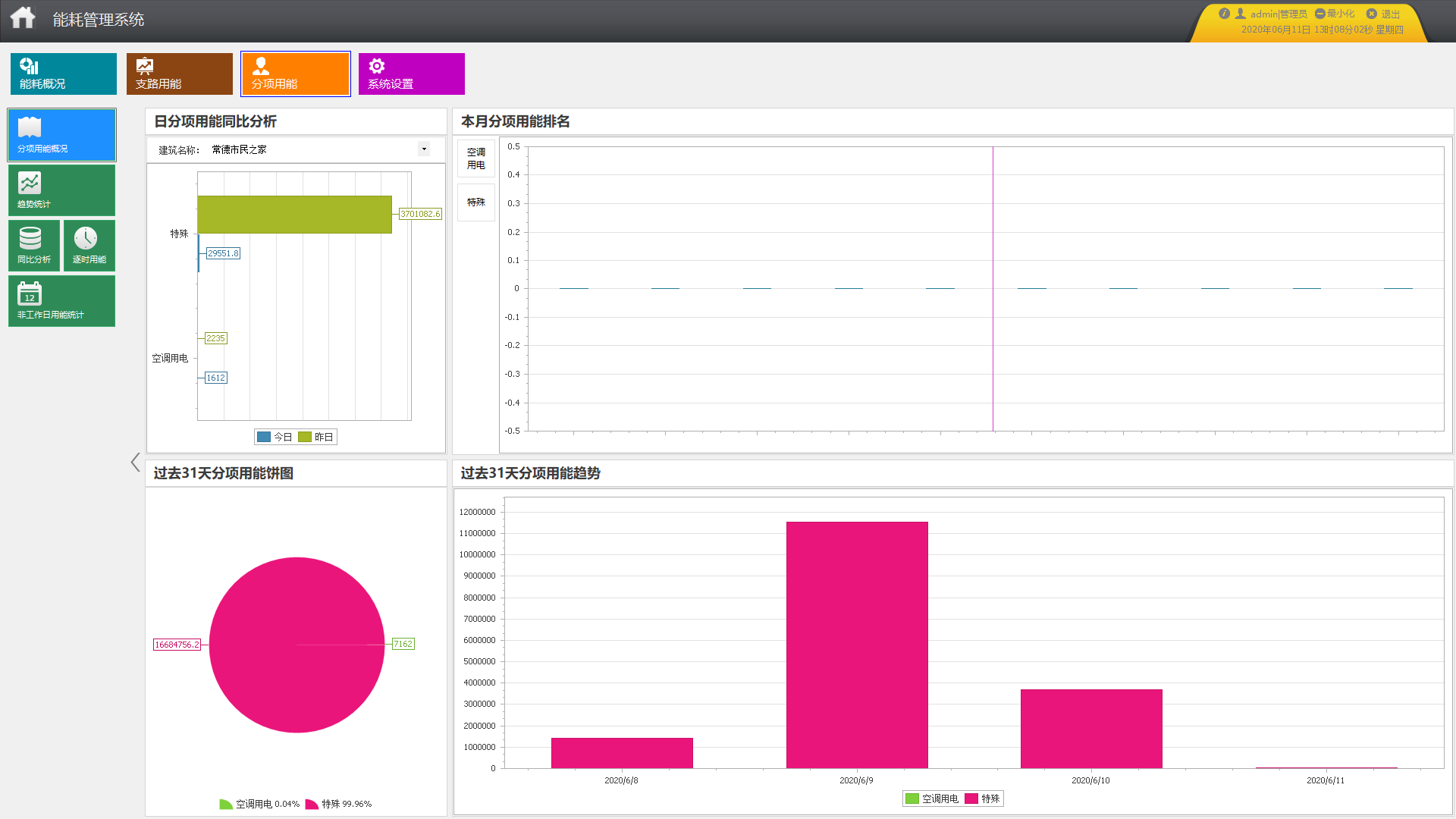 系統可以按照分項進行能耗統計與顯示。其中,日分項用能同比分析圖顯示不同分項的當日與昨日能耗柱狀圖(藍色柱表示今日,綠色柱表示昨日);用能餅圖顯示各分項過去31天的用能占比;堆積圖顯示各分項過去31天的能耗趨勢;分項用能排名圖顯示被選中分項對應能耗值排名前10位的支路。