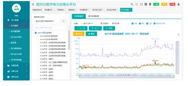 電力數據顯示變電所各回路的電力數據和曲線,包括電流、相電壓、線電壓、頻率、功率因數、有功功率、無功功率、視在功率等參數,并可導出圖表。