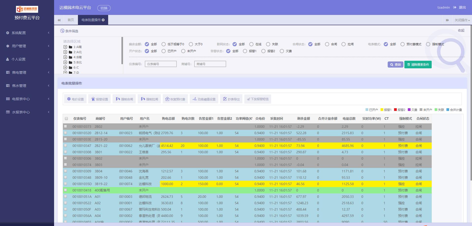 系統(tǒng)針對商鋪開戶不僅支持一戶一表,也支持一戶掛多表的需要;同時(shí)支持和解決了項(xiàng)目改造后新老表切換時(shí),老表金額轉(zhuǎn)入的問題;支持峰谷電價(jià),支持一表一電價(jià);可對單表設(shè)置功率過載的閾值,也支持設(shè)置單表金額報(bào)警的兩級閾值。