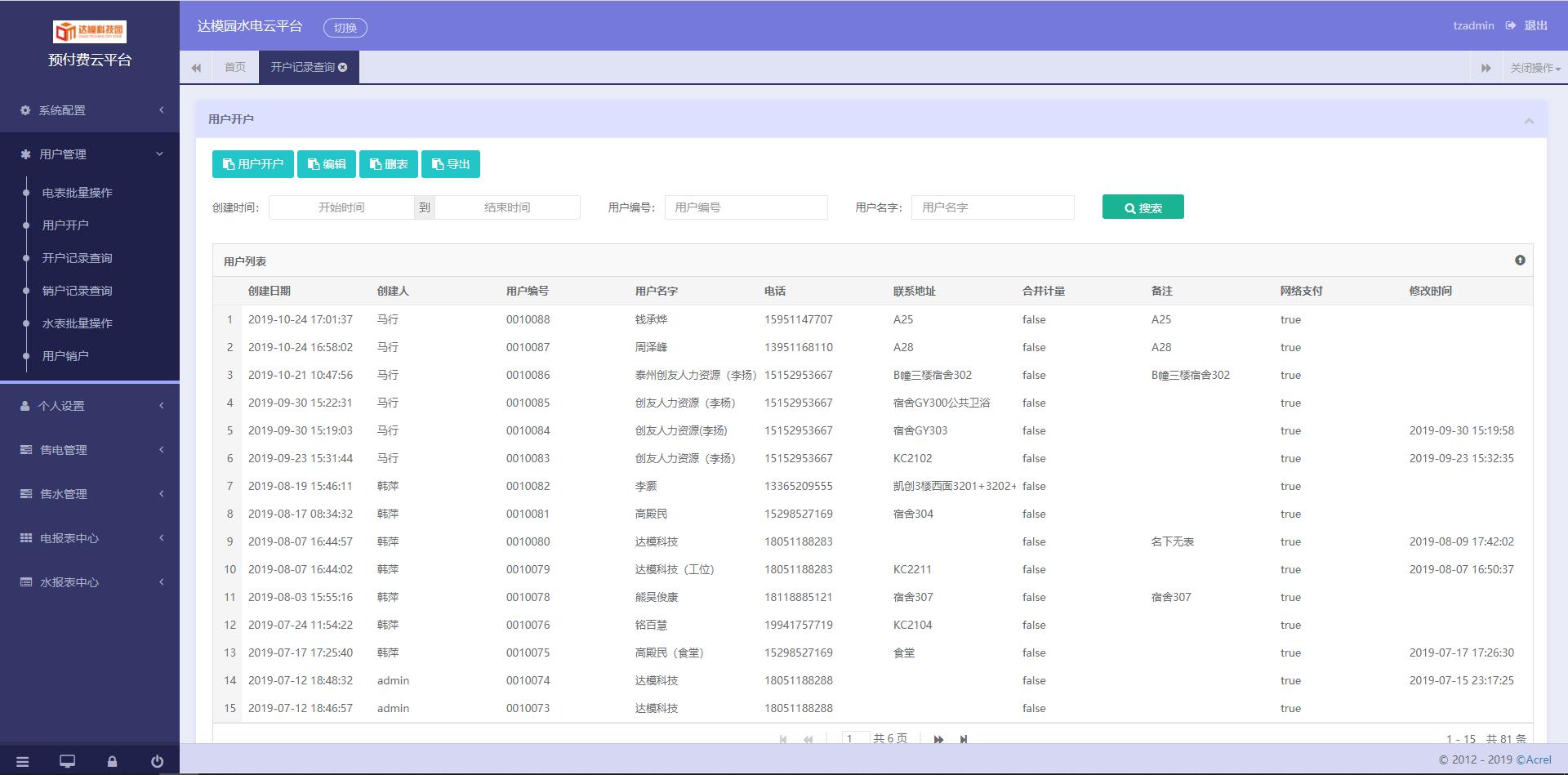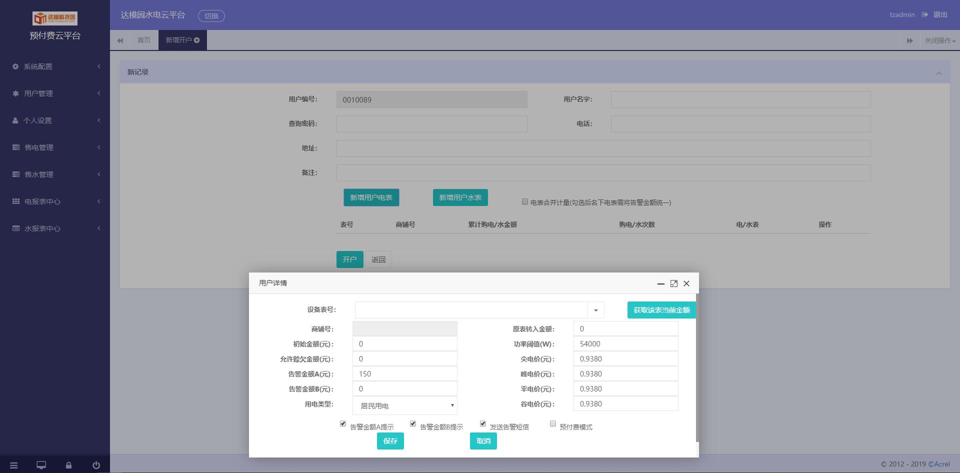 用戶通過網(wǎng)頁進(jìn)行登錄,系統(tǒng)管理員可以分配各子賬戶及相應(yīng)權(quán)限。查看系統(tǒng)日志等功能;系統(tǒng)設(shè)置:對建筑、通訊管理機(jī)、儀表及默認(rèn)參數(shù)進(jìn)行配置;用戶管理:對商鋪用戶執(zhí)行開戶、銷戶、遠(yuǎn)程分合閘、抄表導(dǎo)出及記錄查詢等操作;售電管理:對已開戶的表進(jìn)行遠(yuǎn)程售電、退電、沖正及記錄查詢等操作;報(bào)表中心:提供售電財(cái)務(wù)報(bào)表、用能報(bào)表、報(bào)警報(bào)表等查詢。