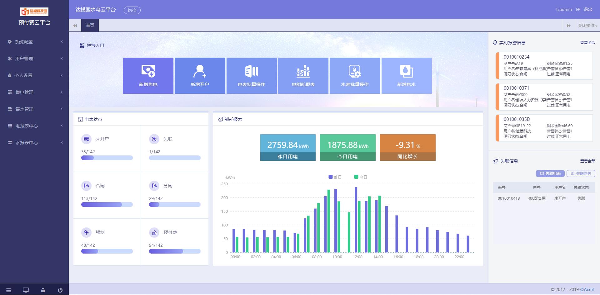 系統(tǒng)登錄首頁,首頁提供新增售電售水、新增開戶、銷戶等快捷入口,實(shí)時(shí)顯示所有儀表的在線狀態(tài),以柱狀圖的形式展示整個(gè)項(xiàng)目的能耗柱狀圖等功能。