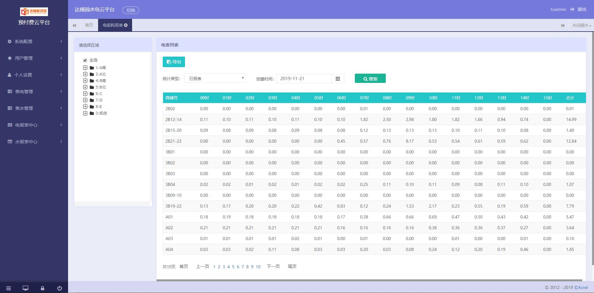 系統(tǒng)還提供了多個(gè)報(bào)表以供查詢,分別是日/月/年財(cái)務(wù)銷售統(tǒng)計(jì)報(bào)表、失聯(lián)表/通訊管理機(jī)查詢報(bào)表、開戶充值查詢報(bào)表、能耗查詢報(bào)表、實(shí)時(shí)報(bào)警/歷史報(bào)警查詢報(bào)表,支持導(dǎo)出。以下是財(cái)務(wù)報(bào)表和預(yù)付費(fèi)表日用能查詢報(bào)表: