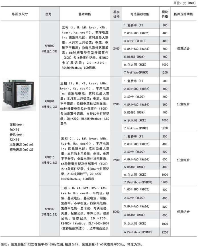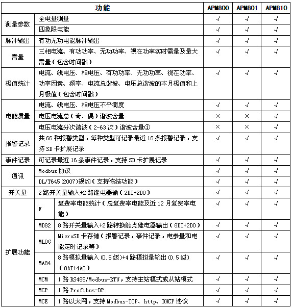 APM系列網(wǎng)絡電力儀表按IEC標準設計,具有全電量測量,電能統(tǒng)計,電能質(zhì)量分析及網(wǎng)絡通訊等功能,主要用于對電網(wǎng)供電質(zhì)量的綜合監(jiān)控診斷及電能管理。該系列儀表采用了模塊化設計,當客戶需要增加開關量輸入輸出,模擬量輸入輸出,SD卡記錄,以太網(wǎng)通訊時,只需在背部插入對應模塊即可。