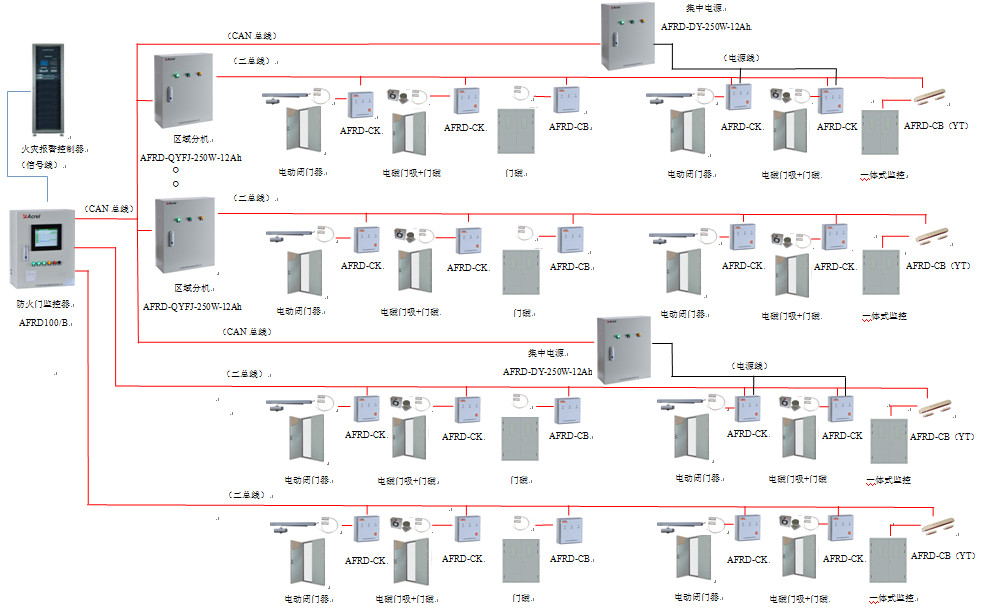 AFRD100防火門監控系統采用AFPM100/B防火門監控器(主機)+區域分機+防火門監控模塊三層結構組網模式,適用范圍廣,滿足各種環境的現場,便于區域化管理,監控模塊與監控器之間采用二總線通訊,監控器與分機之間采用CAN總線通訊,滿足了通訊實時性高的要求。
