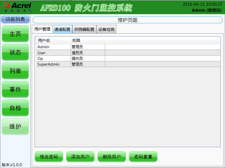 該界面設有三種操作級別,操作權限級別依次為“超級管理員”→“管理員”→“操作員”,其中高級別可添加低級別的新用戶。