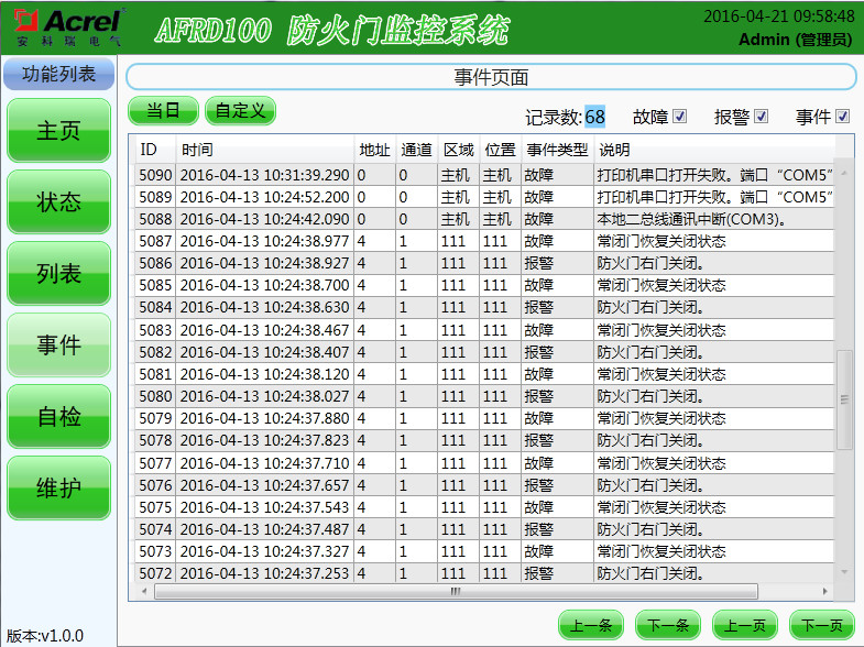 該界面可顯示當前存儲的報警記錄、故障記錄和事件記錄,可選擇查詢當天記錄也可以自定義查詢日期。