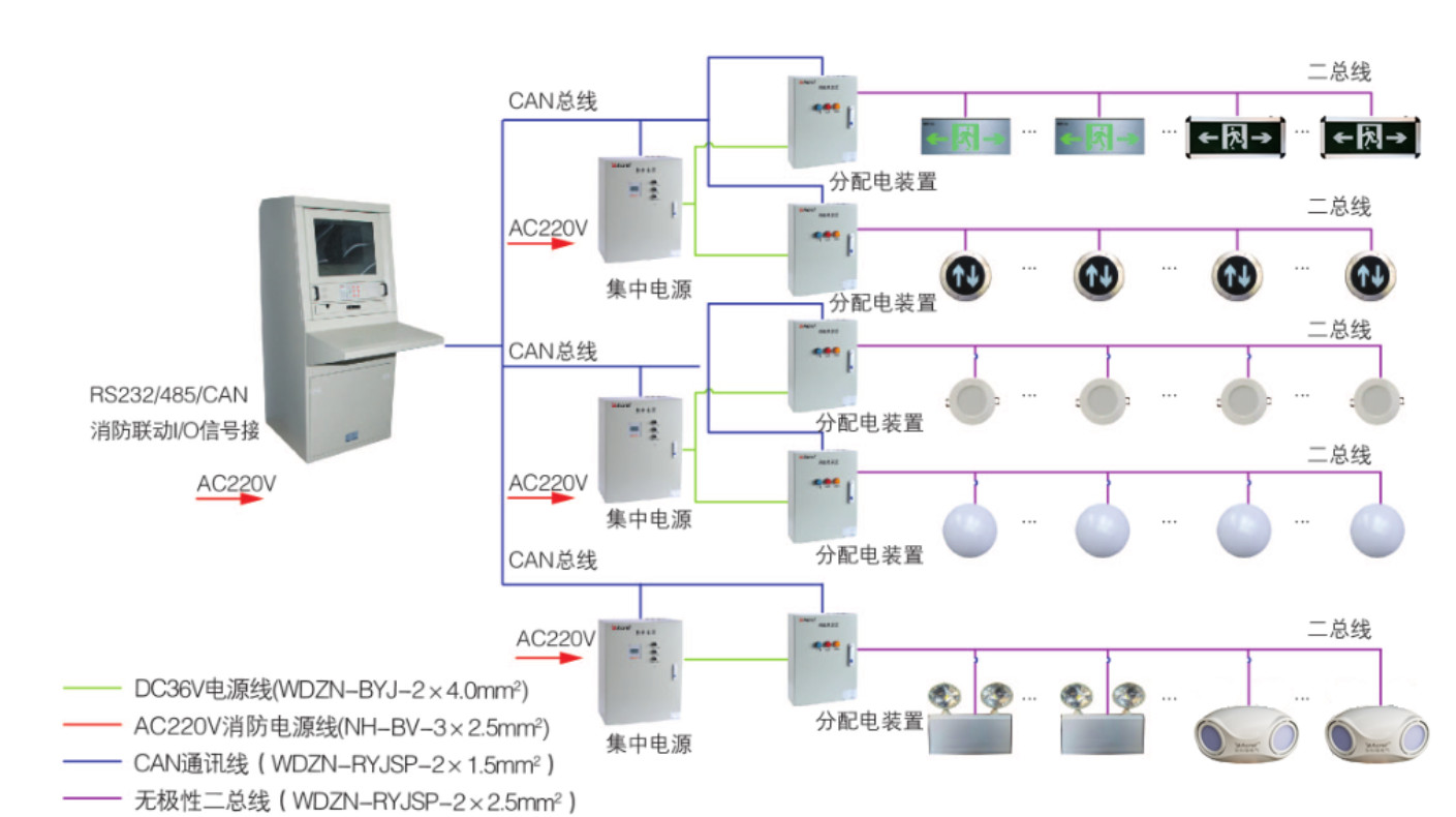集中電源集中控制型消防應(yīng)急照明和疏散指示系統(tǒng)采用應(yīng)急照明控制器(主機(jī))+集中電源+分配電裝置+燈具四層結(jié)構(gòu)組網(wǎng)模式,適用范圍廣,滿足各種環(huán)境的現(xiàn)場(chǎng),便于區(qū)域化管理,燈具與分配電裝置之間采用二總線通訊,監(jiān)控器與集中電源、分配電裝置之間采用CAN總線通訊,滿足了通訊實(shí)時(shí)性高的要求。